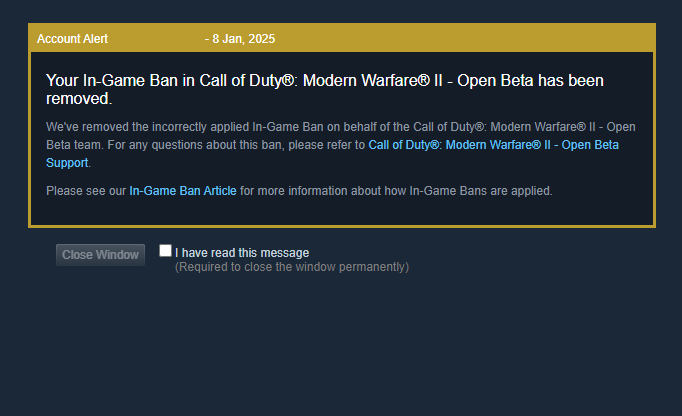 For over 2 years (763 days as of writing) I was wrongly accused of cheating and false banned from Call of Duty: Modern Warfare 2022. As of 08/01/2025, this has been officially lifted on all platforms.