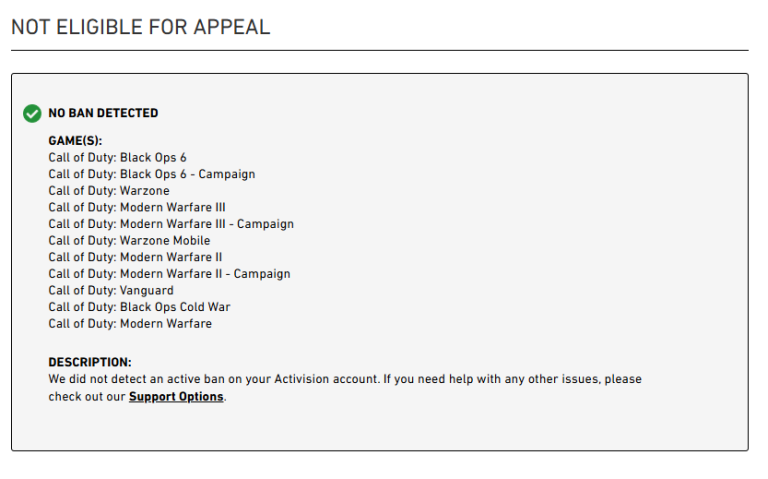 Naturally, I am annoyed about this and the appeals to get this reversed begin. Returning back to Activision’s website you will find nothing of use. I tried to appeal via the website however it was denied (yet to see one get accepted). Activision does not let you appeal more than once which starts the process of trying other places to plead your case.